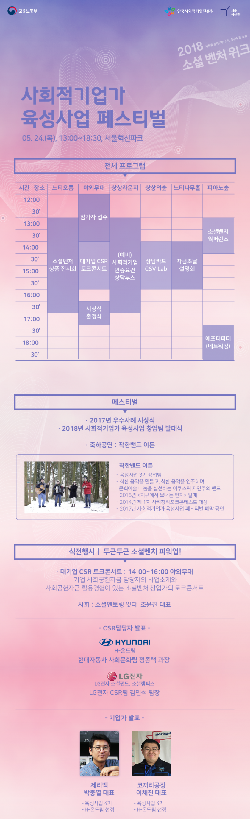 서울혁신파크 상상청 앞 야외무대에서 열리는 ‘2018 사회적기업가 페스티벌’은 2018년 육성사업에 선정된 창업팀 발대식과 지난해 우수 창업팀 사례공유 및 시상식이 전개될 예정으로 기업 사회공헌자금 담당자의 사업 소개와 사회공헌자금 활용 경험이 있는 소셜벤처 창업가의 토크콘서트, 상품경쟁력 강화를 위한 MD품평회 등 다양한 참여형 부대행사로 진행됩니다.