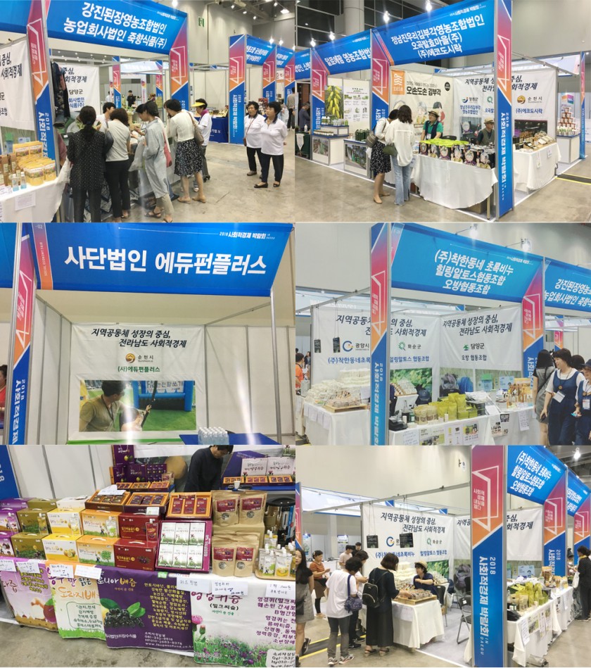 사회적경제 통합 박람회인만큼 전국에서 모인 사회적경제기업들의 다양한 제품이 전시·판매되었는데 전남 지역은 11개사 30개 품목인 황칠달걀, 황칠액기스, 도라지배즙, 김부각, 천연염색제품, 작두콩차, 천연EM비누, 꽃차, 장류, 발효식초, 생국수, 문화예술교육 체험프로그램 등이 판매부스를 통해 소개되었습니다.