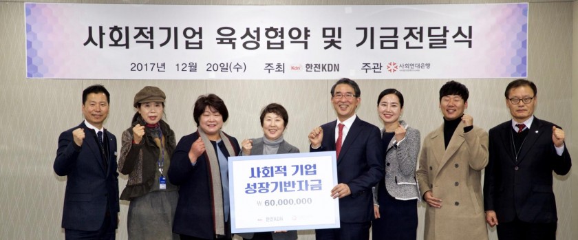 한전KDN은 지난 11월 8일부터 사회연대은행 홈페이지를 통해 ‘사회적기업 성장기반자금 지원사업 공모’를 진행하였으며, 세 차례의 심사를 거쳐 4개 사회적 기업을 최종 지원 대상으로 선정하고 이날 기금 전달식을 가졌다.