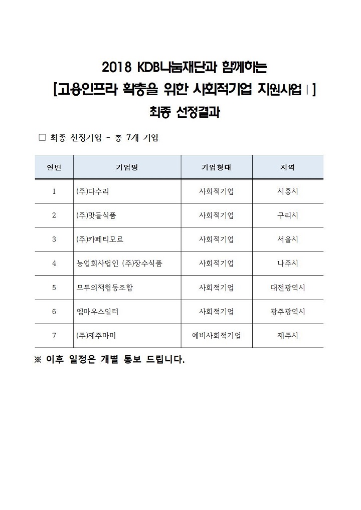 [한국사회적기업진흥원] KDB나눔재단과 함께하는 [고용인프라 확충을 위한 사회적기업 지원사업 1] 최종 선정결과