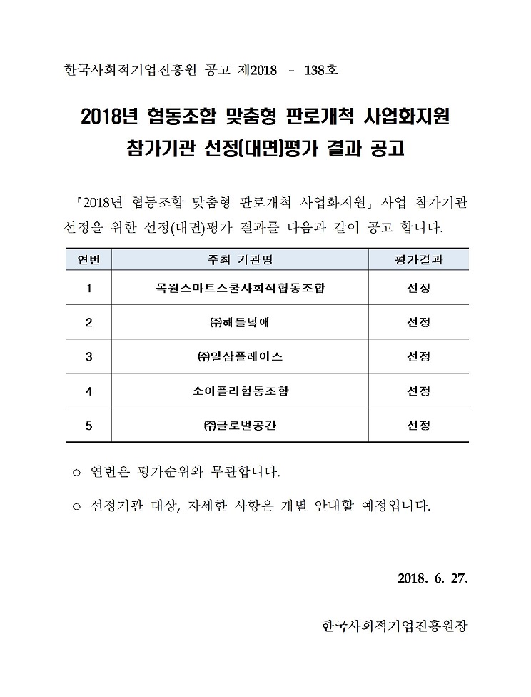 [한국사회적기업진흥원] 2018년 협동조합 맞춤형 판로개척 사업화지원 참가기관 선정(대면)평가 결과 공고