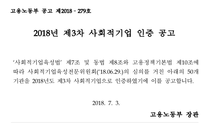 [고용노동부] 2018년 3차 사회적기업 인증 공고