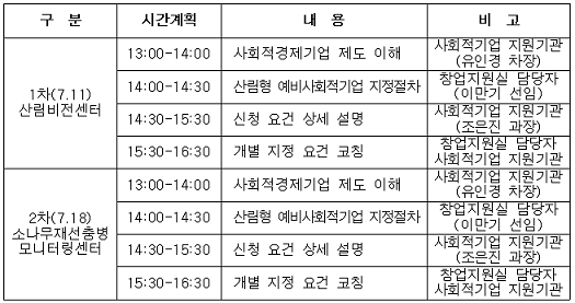 주요내용 : 사회적경제이해, 산림형 예비사회적기업 지정절차, 신청 요건 코칭