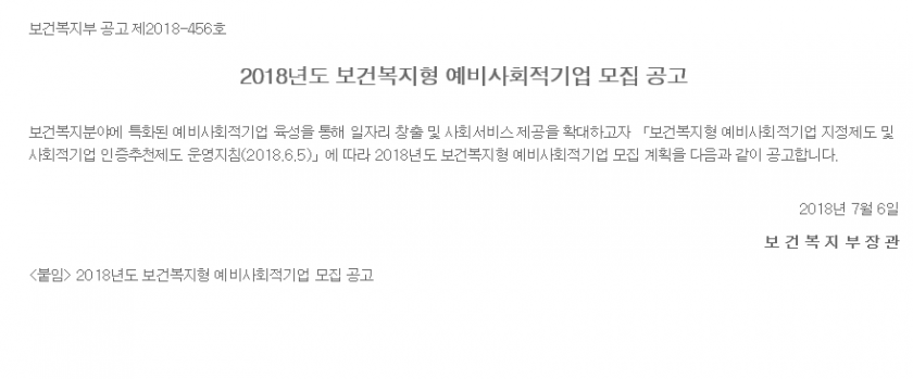 [보건복지부] 2018년도 보건복지형 예비사회적기업 모집 공고