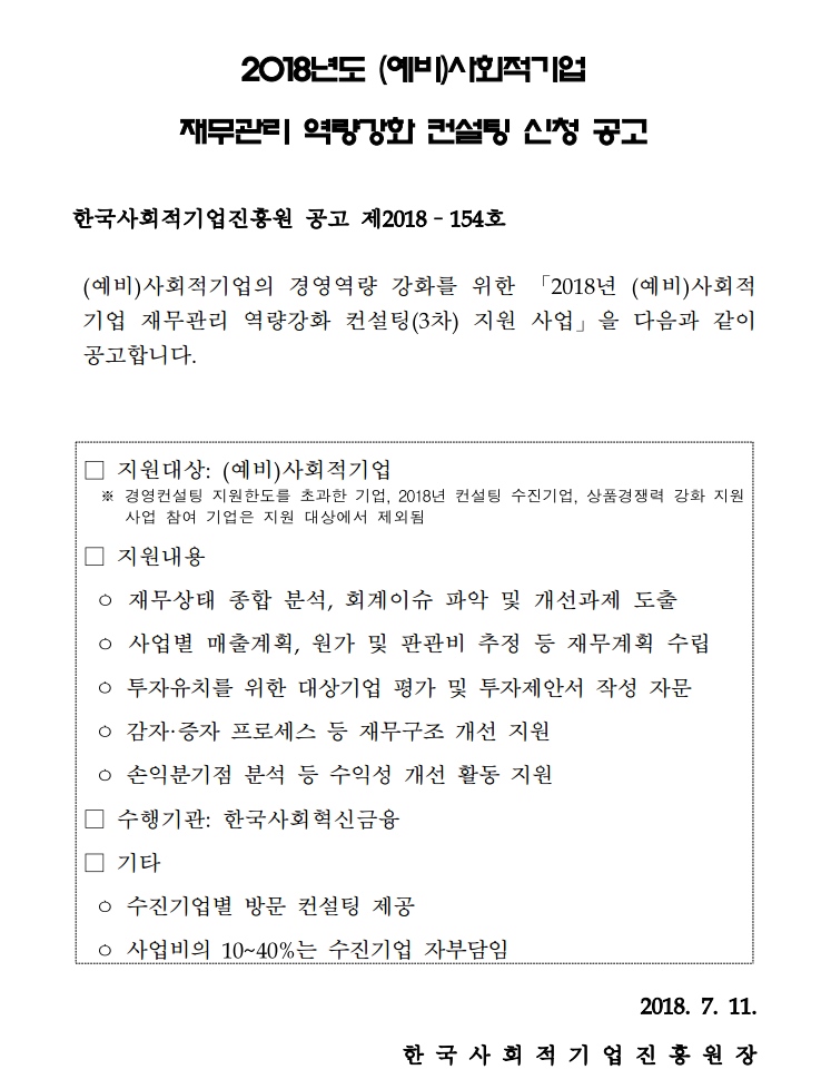 [한국사회적기업진흥원] 2018년도 (예비)사회적기업 재무관리 역량강화 컨설팅 신청 공고