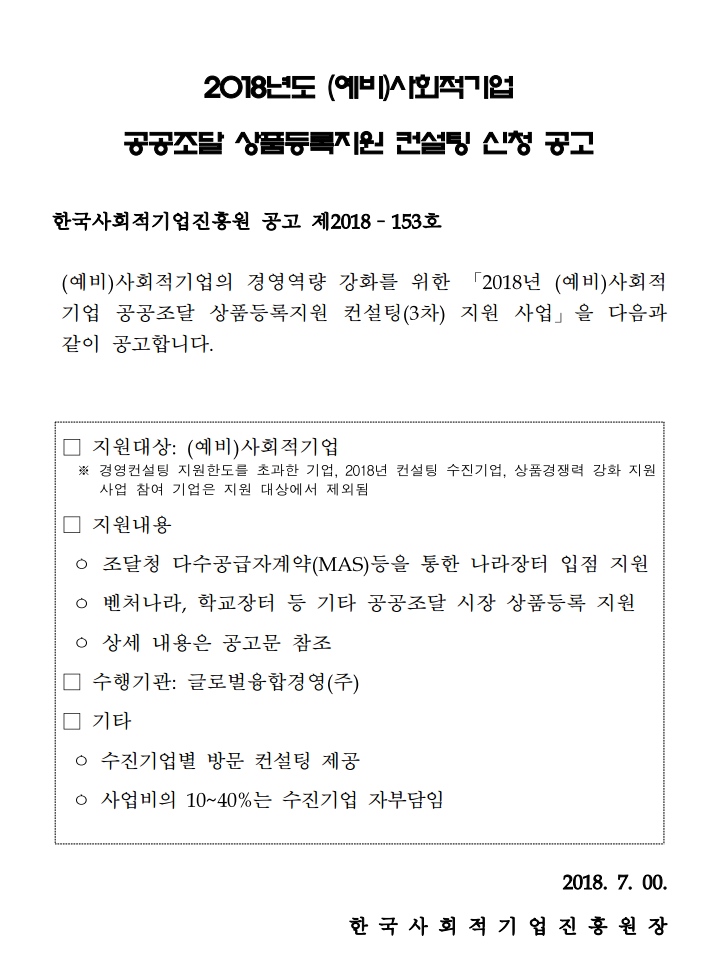 [한국사회적기업진흥원] 2018년도 (예비)사회적기업 공공조달 상품등록지원 컨설팅 신청 공고