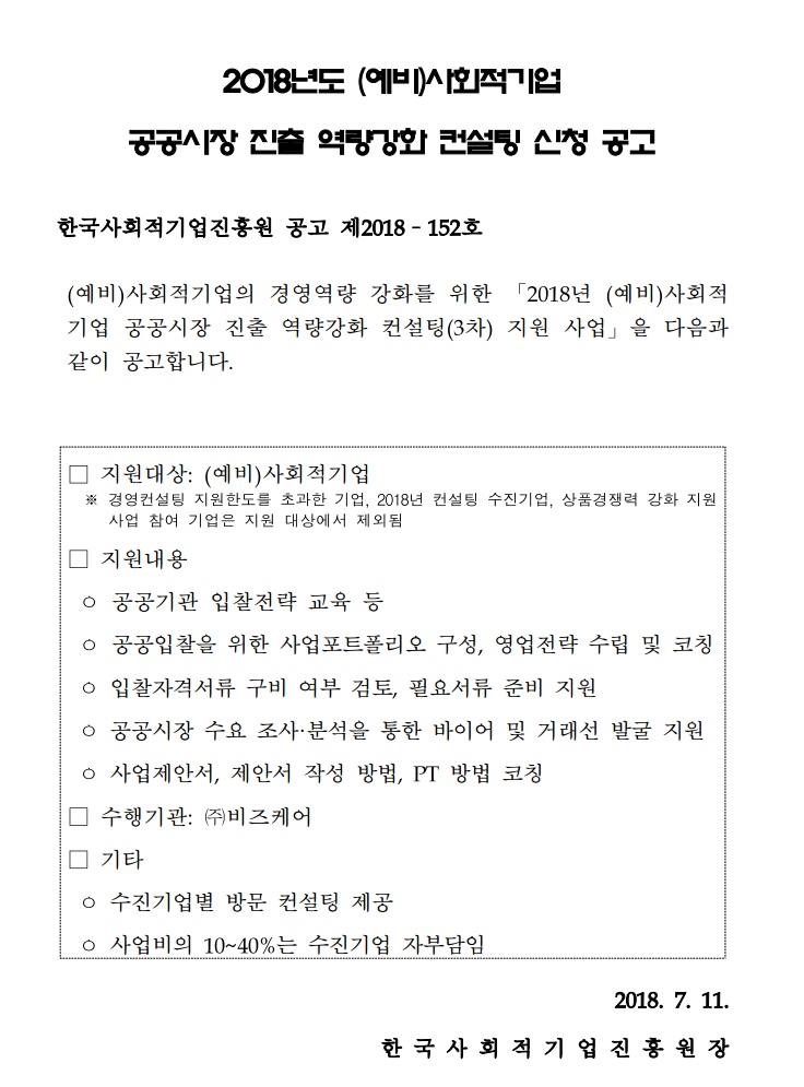 [한국사회적기업진흥원] 2018년도 (예비)사회적기업 공공시장 진출 역량강화 컨설팅 신청 공고