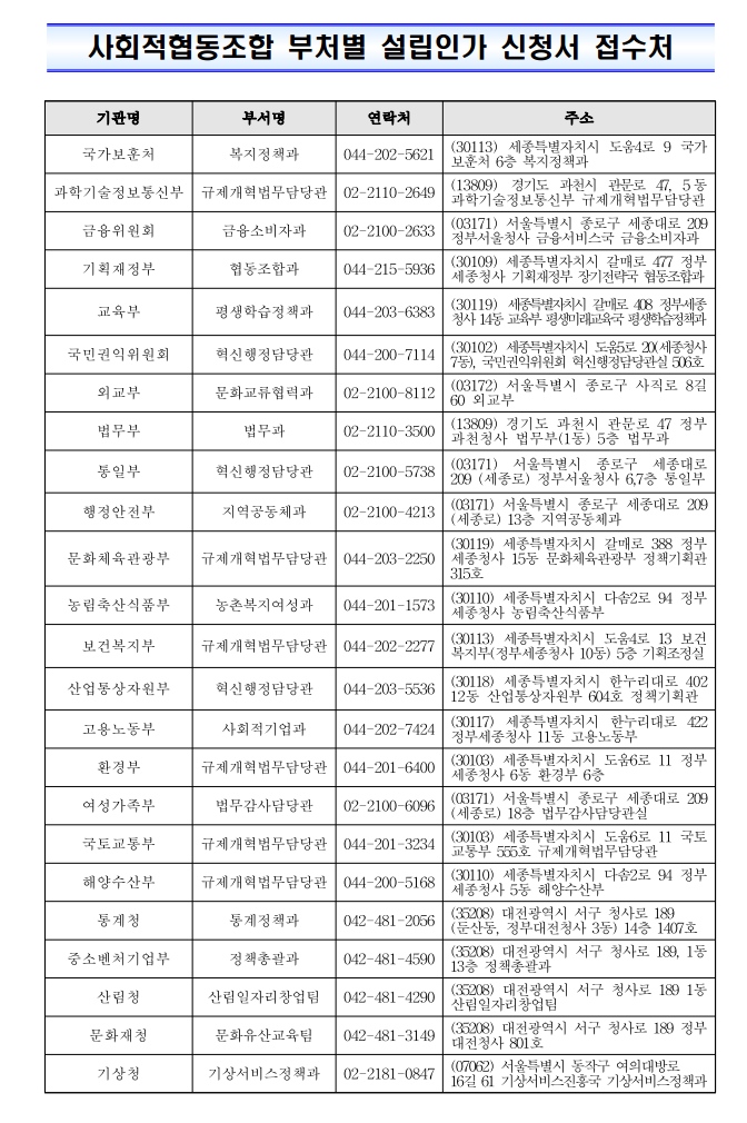 사회적협동조합 부처별 설립인가 신청서 접수처를 아래와 같이 안내해드립니다.