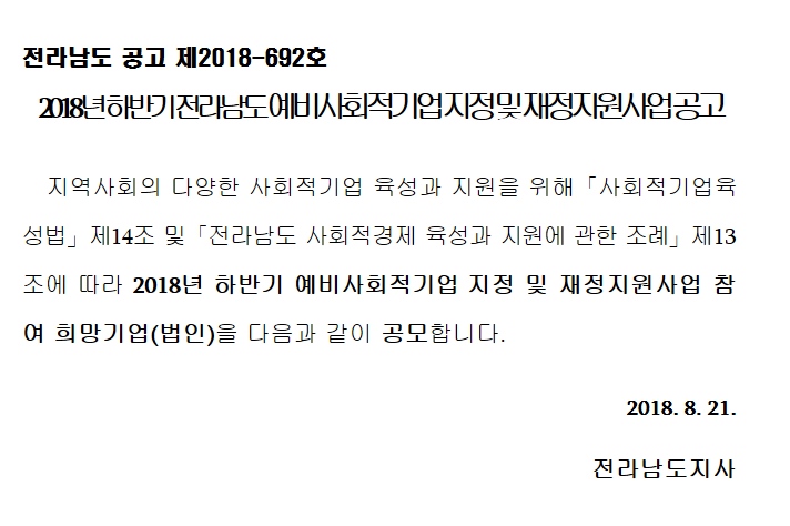 [전라남도] 2018년 하반기 전라남도 예비사회적기업 지정 및 재정지원사업 공고(~9/3)