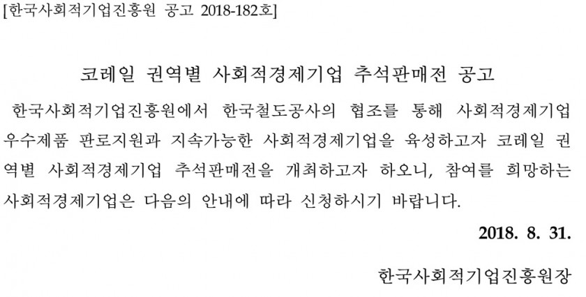 코레일 권역별 사회적경제기업 추석판매전 공고(~9/10)