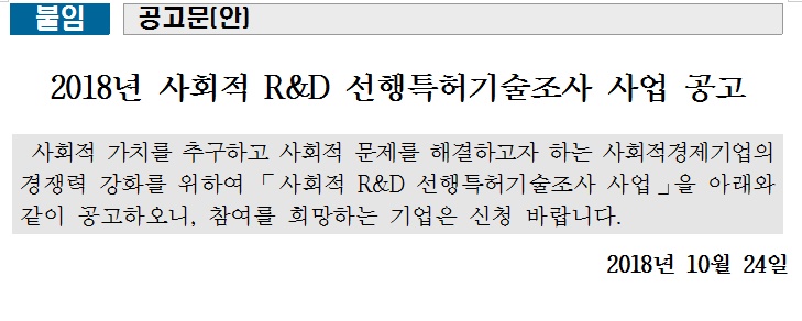 2018 사회적 RD 선행특허기술조사 사업 공고문최종.hwp (455.5K)
