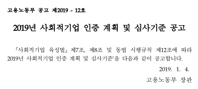 [고용노동부공고] 2019년 사회적기업 인증 계획 및 심사기준 공고