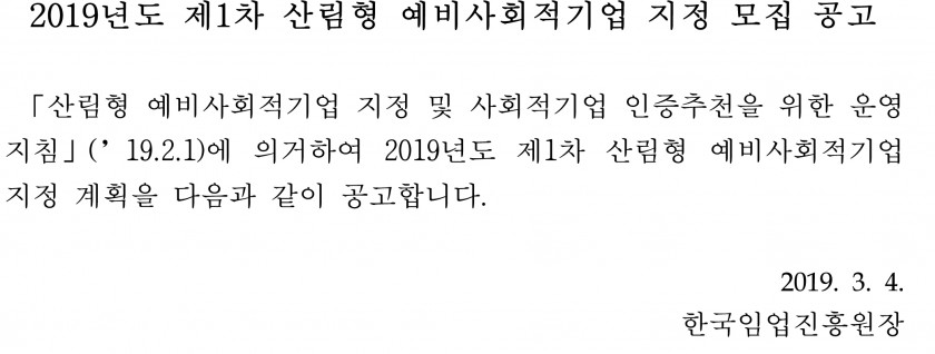 [한국임업진흥원] 2019년도 제1차 산림형 예비사회적기업 지정 모집 공고 알림(~3/22)